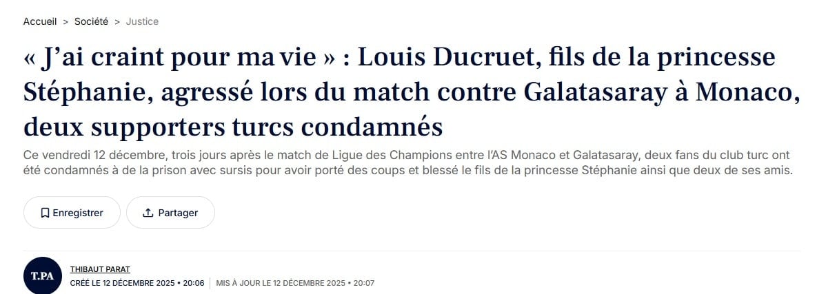 Fransızca yayın yapan NiceMatin gazetesi, maç gecesi karlılaşmayı izlemek için Monako’ya gelen ve normal şartlar altında Paris’te yaşayan Türk baba ve oğul tarafından Monako Prensesi Stéphanie Marie Elisabeth Grimaldi’nin 33 yaşındaki oğlu Louis Decruet’in darp edildiğini açıkladı.